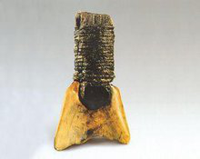 在離稻谷不遠的地方,泥土中出現了許多骨制的東西。在這些出土的骨制品中,他們發現其中的一件上面還纏著葛藤,這正是河姆渡人的生產工具——骨耜。